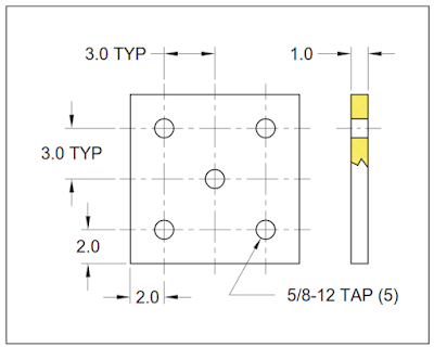 Đối với mũi khoan miệng (Ø0.750) sẽ dùng chu kỳ G82 với khoảng tạm dừng 0.2 giây ở chiều sâu Z-0.3275. Đối với khoan để tarô ren, sử dụng chu kỳ G81, và tarô ren, với mũi tarô 5/8-12, sẽ dùng chu kỳ G84. Mũi khoan miệng chuẩn bị lỗ để khoan và tạo ra sự lả miệng 0.015 inch. Mũi khoan đế tarô ren là loại 35/64 (00.5469), tạo lỗ cho mũi tarô 5/8-12: