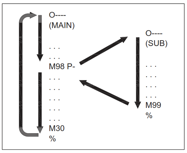Nói chung, hàm kết thúc chương trình con M99 đưa sự xử lý trở lại block ngay sau block chứa lệnh gọi chương trình con M98. Khái niệm này được minh họa trên Hình 2 (không ghi số block).
